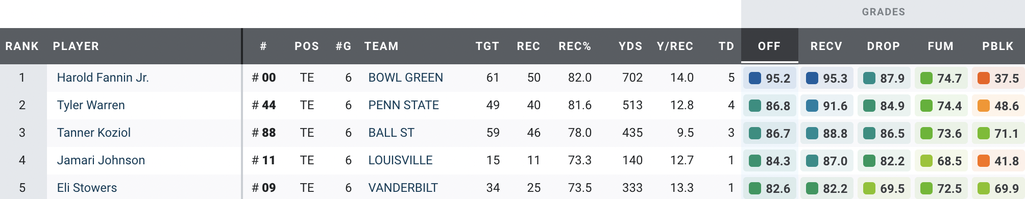 This was the most difficult position to pick, as Bowling Green’s Harold Fannin Jr. has also been special. We’ll give the slight edge to Warren, as he plays at the Power Four level while having similarly absurd stats. He ranks second to Fannin in PFF overall grade (86.8), receiving yards (513) and yards after the catch (294). In Week 7 against USC, Warren tied an FBS tight end record with 17 catches, which went for 224 yards and a touchdown. He has also rushed for and thrown a touchdown this year, doing it all for the Nittany Lions’ offense.