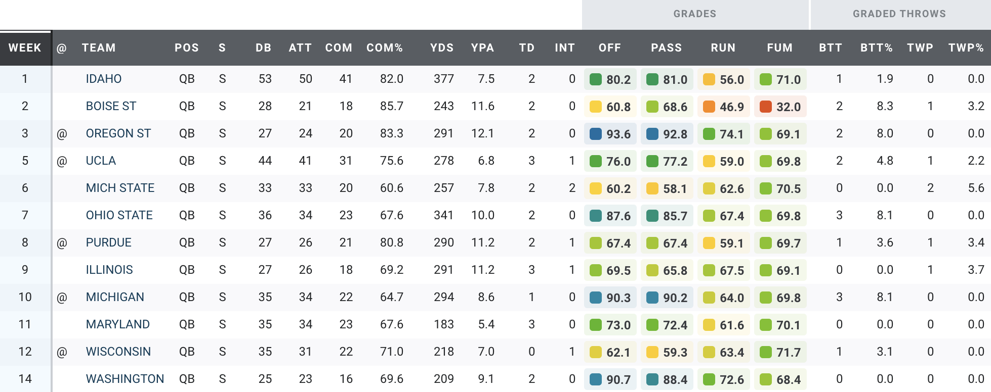 Gabriel was efficient in the Ducks' final home game of the season, going 16-of-23 passing for 209 yards and a pair of touchdowns. He didn’t have any big-time throws in the game but also avoided turnover-worthy plays. Gabriel finished the contest with an 88.4 PFF passing grade.