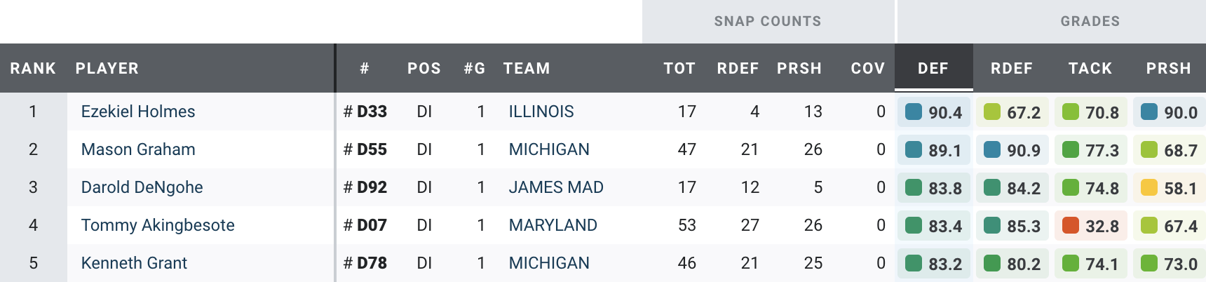 Graham, the Wolverines' highest-graded defensive player in Week 14, earned an 89.1 PFF overall grade thanks to a dominant showing against the run. He posted a 90.9 PFF run-defense grade after logging a defensive stop on 25.0% of his 20 run-defense snaps.
