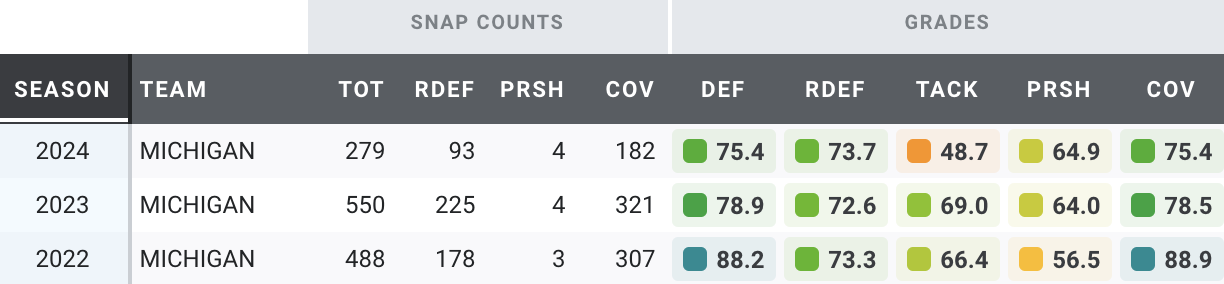 Carl Granderson has proven to be a solid long-term edge defender, but Chase Young (53 pressures) may not be back in New Orleans next year, plus has struggled against the run (47.9 PFF run-defense grade). Nic Scourton hasn’t been quite as monstrous in 2024 but has stacked consecutive years with a 75.0-plus PFF run-defense grade.