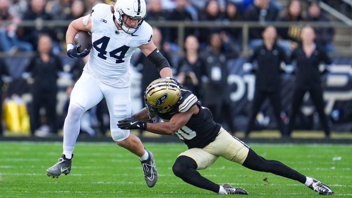 2YK2CD9 Penn State tight end Tyler Warren (44) tries to go over Purdue defensive back Kyndrich Breedlove (10) during the first half of an NCAA college football game in West Lafayette, Ind., Saturday, Nov. 16, 2024. (AP Photo/Michael Conroy)