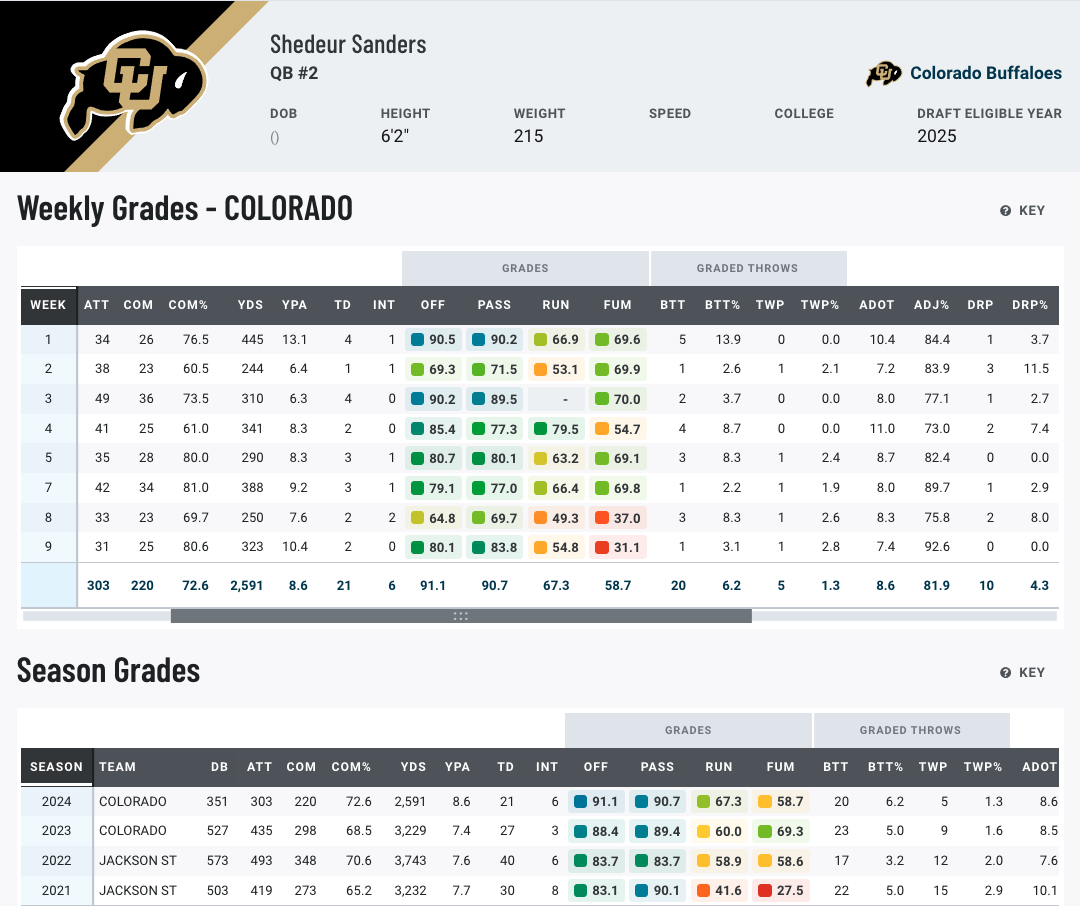 The Colorado quarterback is on track for a career-high PFF grade this year, having earned a 90.7 PFF passing grade. He has completed 220 of his 303 passes for 2,591 yards, with a 6.2% big-time throw rate and a 1.3% turnover-worthy play rate.