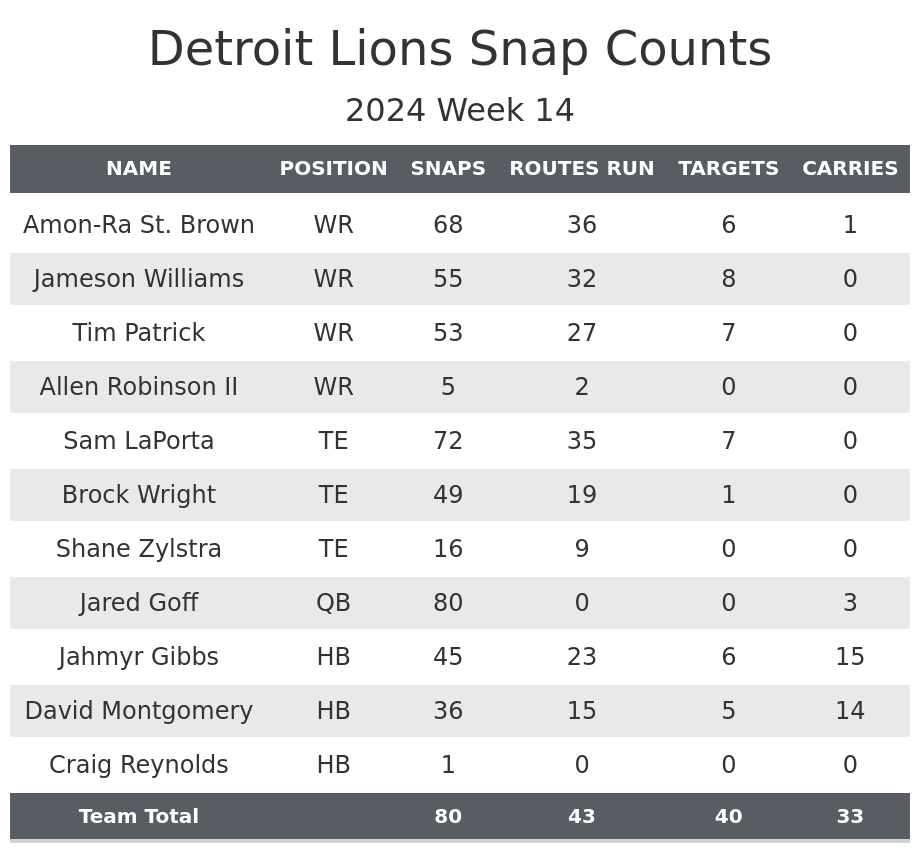 The increase in snaps in this game was a result of more usage in 12 personnel and other plays with few wide receivers on the field. He had typically played one-third of snaps, at best, in 12 personnel, mostly rotating in for Williams. Similarly, St. Brown and Williams rotated as the sole wide receiver in three tight end sets in the last month. Patrick only played two snaps from that personnel group all season prior to this week. In this game, he and Williams were in more of a 50-50 split in those personnel groups.