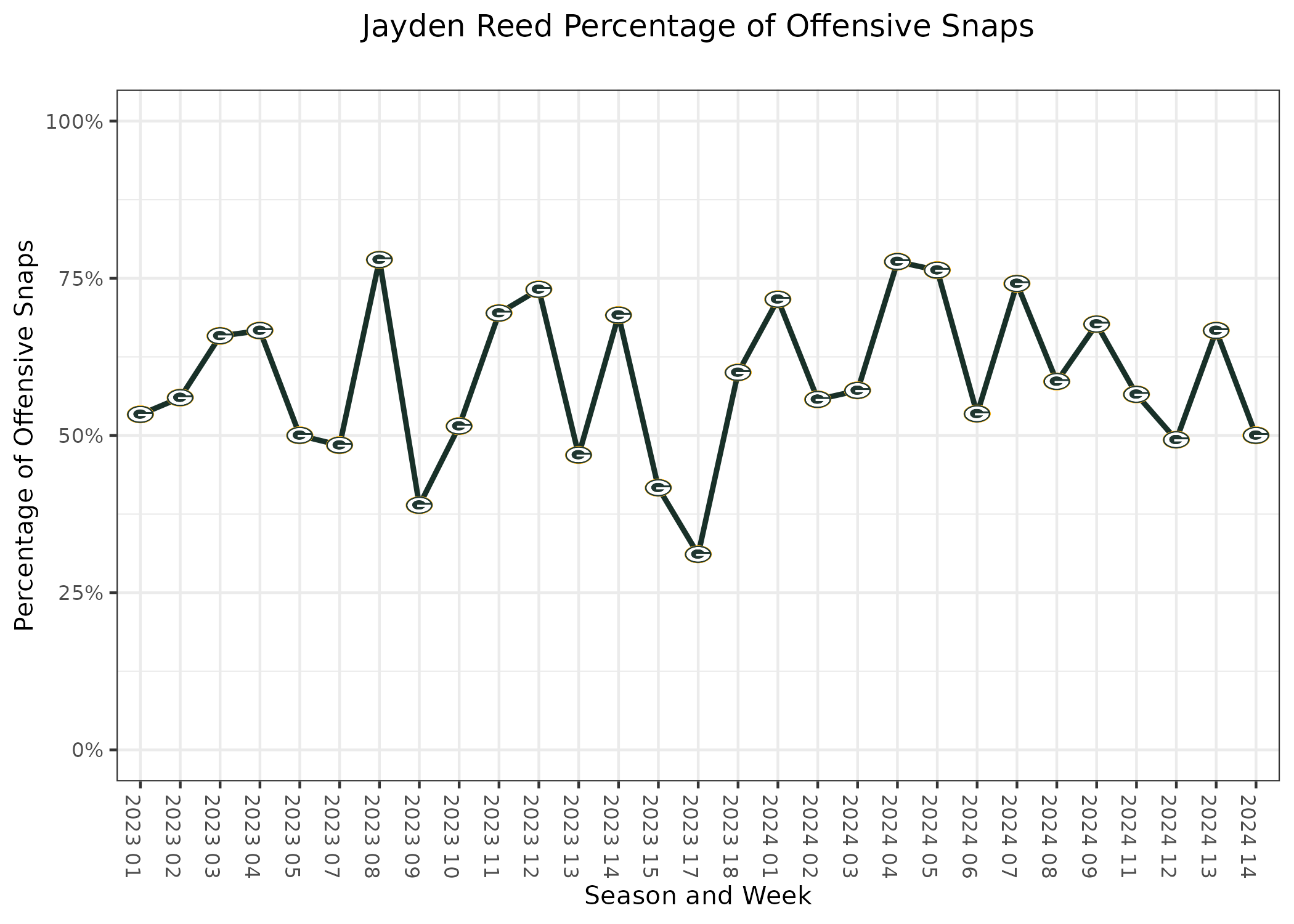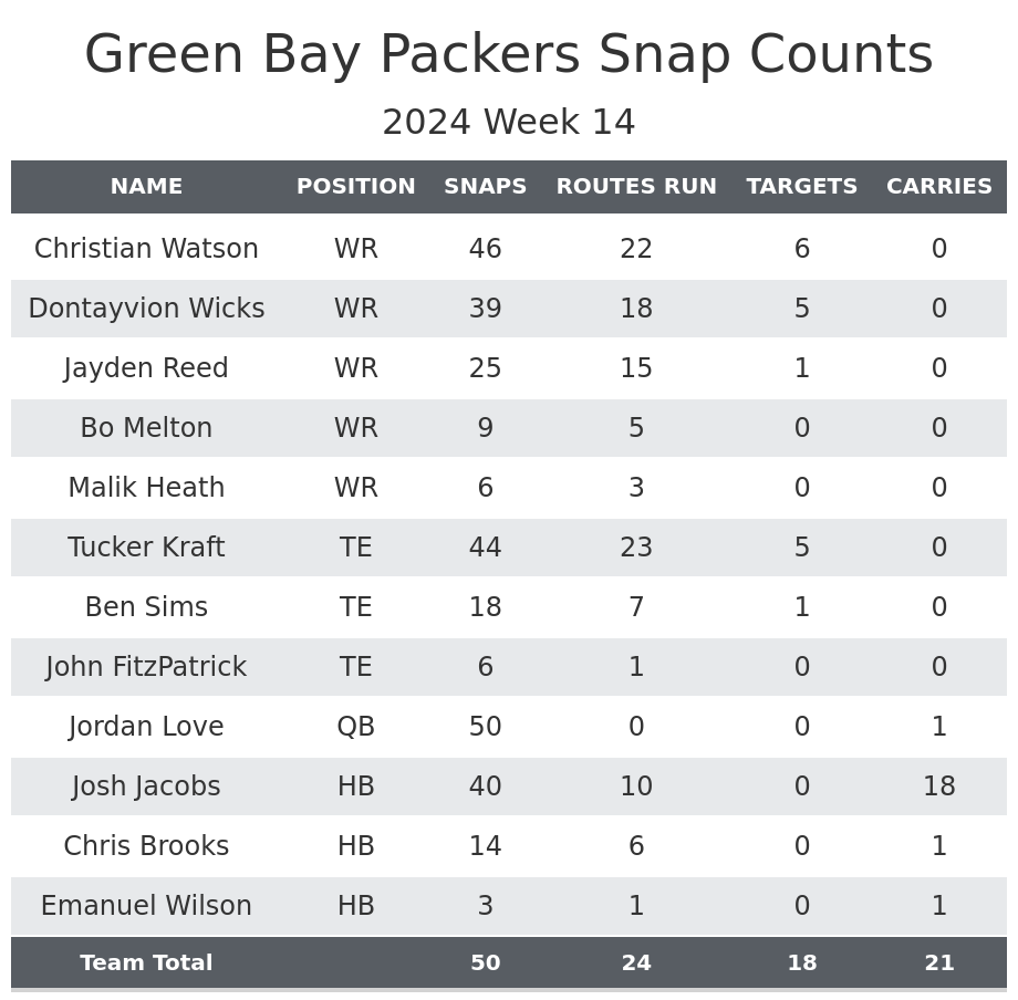 The injury to Doubs had no impact on Jayden Reed’s playing time. Over the first 13 weeks, Reed had played 90% of Green Bay's 11 personnel snaps and 2.6% of the 12 personnel snaps. Those splits were very similar last week and similar in this game despite Doubs being out. Similar to how teams often have running backs who rush for a lot of yards in wins and not as many in losses, Reed averaged 130 receiving yards per game in the Packers' losses and 34 in the Packers' wins prior to this week.
