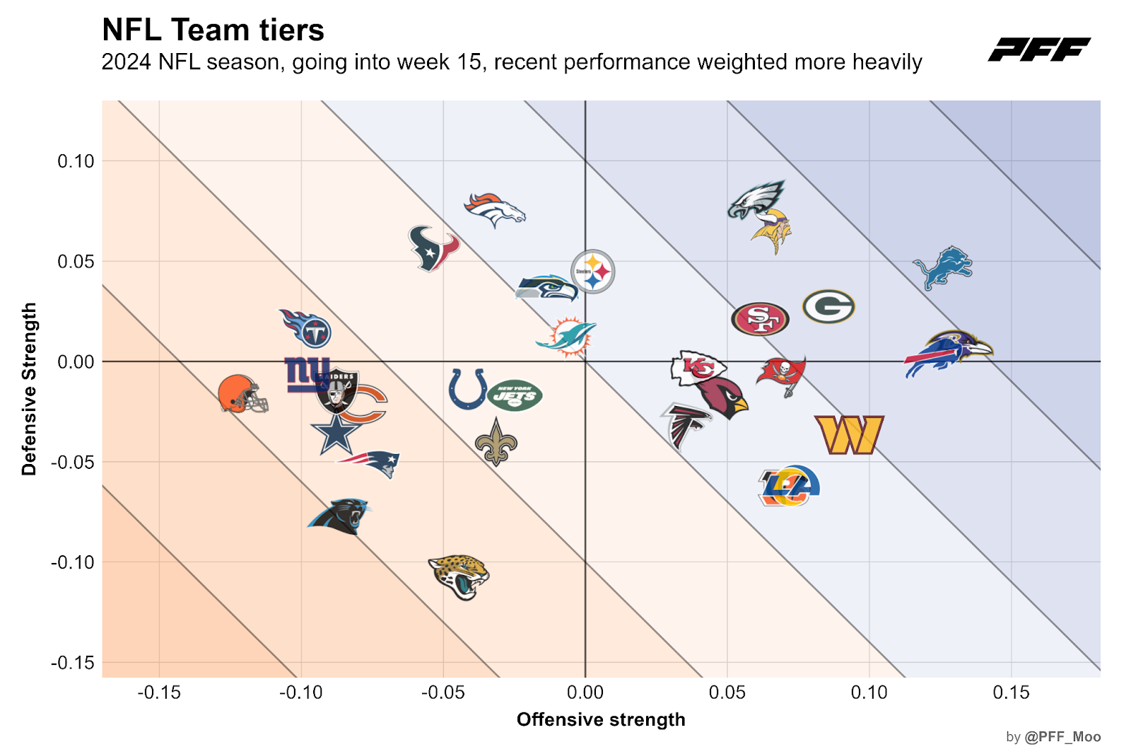 The following chart shows how good teams have been by expected points added per play. To improve predictive power, high-leverage plays such as turnovers and goal-line plays are down-weighted a bit. Additionally, the team strengths account for opponents faced and recent performances count more toward the estimated team strength than performances earlier in the season.