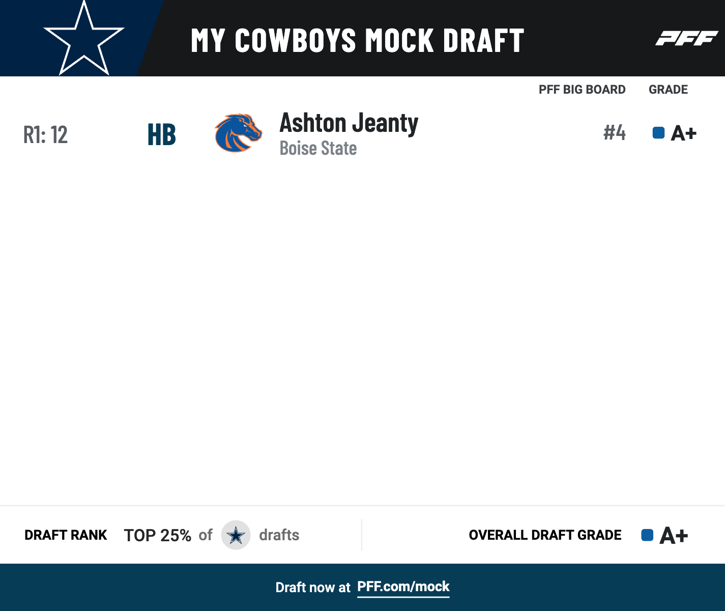 Ashton Jeanty and the Cowboys have long felt like a match made in heaven, and for good reason. Dallas is tied for last in PFF rushing grade, and both Rico Dowdle and Ezekiel Elliott will be free agents. Jeanty is enjoying one of the best seasons for a running back in modern college football history, leading the country (even by a wide margin) in almost every major advanced statistical category.