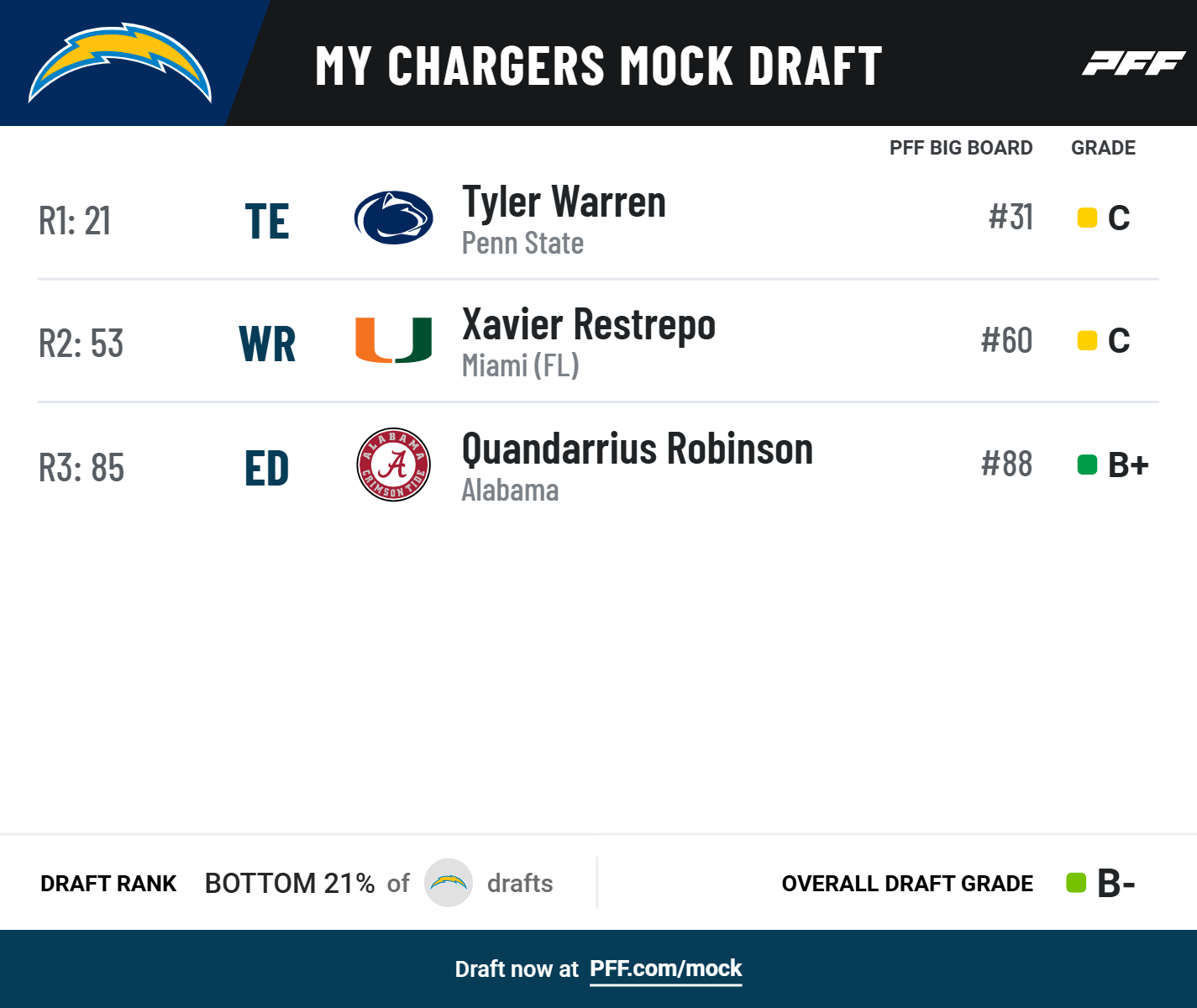 • Draft and trade for yourself: Try PFF's Mock Draft Simulator — trade picks and players and mock for your favorite NFL team.