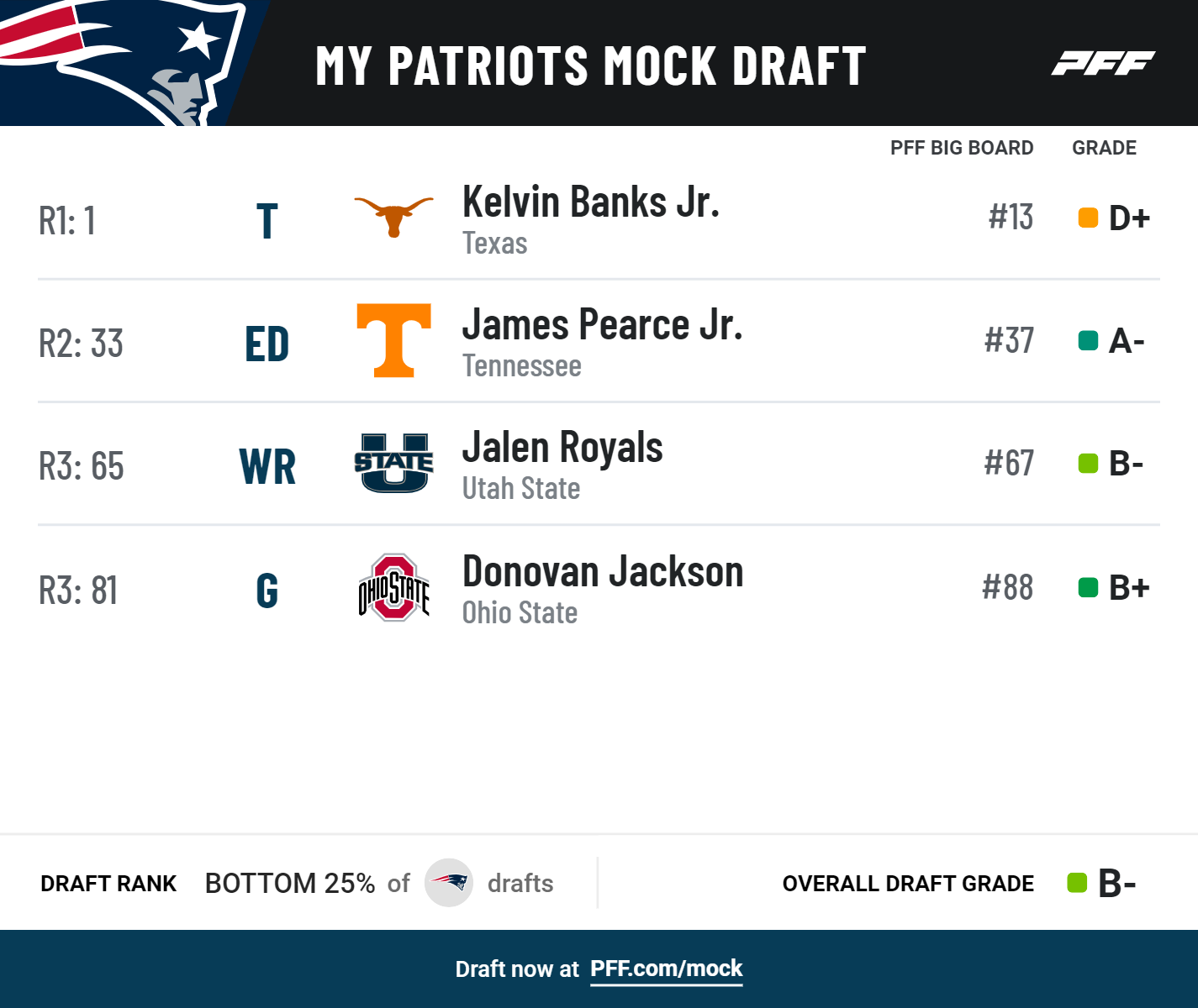 • Offensive tackle is the clear choice with their first pick: Kelvin Banks Jr. would solidify the Patriots' left tackle position for years to come.