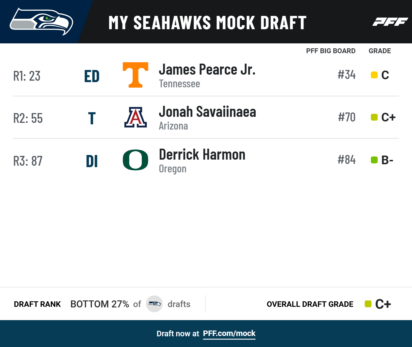• Seahawks add a defensive playmaker in Round 1: Tennessee’s James Pearce Jr. would give Mike Macdonald’s defense another pass-rushing weapon.