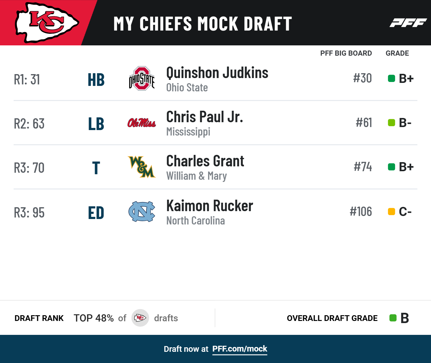 • Draft and trade for yourself: Try PFF's Mock Draft Simulator — trade picks and players and mock for your favorite NFL team.