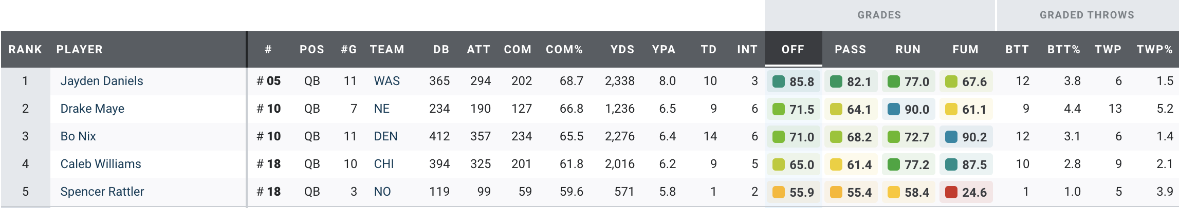 Caleb Williams, Bo Nix and Drake Maye reminded the football world in Week 11 that Jayden Daniels isn't the only rookie quarterback excelling in 2024. All three earned 79.0-plus PFF overall grades to headline the first-round performances this week.