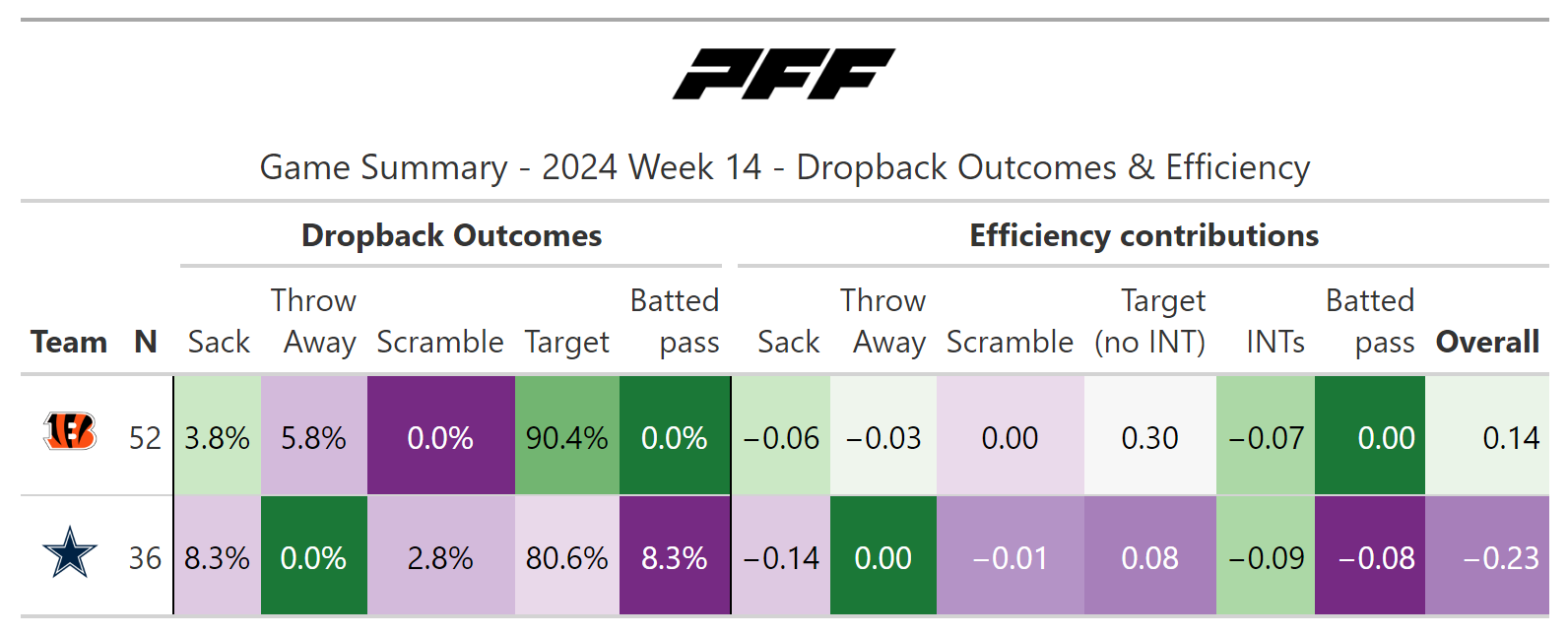 According to PFF's noise-canceled score metric, the Bengals were the better team, even though the game was close in the fourth quarter and they ultimately needed a muffed punt to win the game. The Bengals mostly suffered from an unusually bad performance on third down but were dominant on early downs.